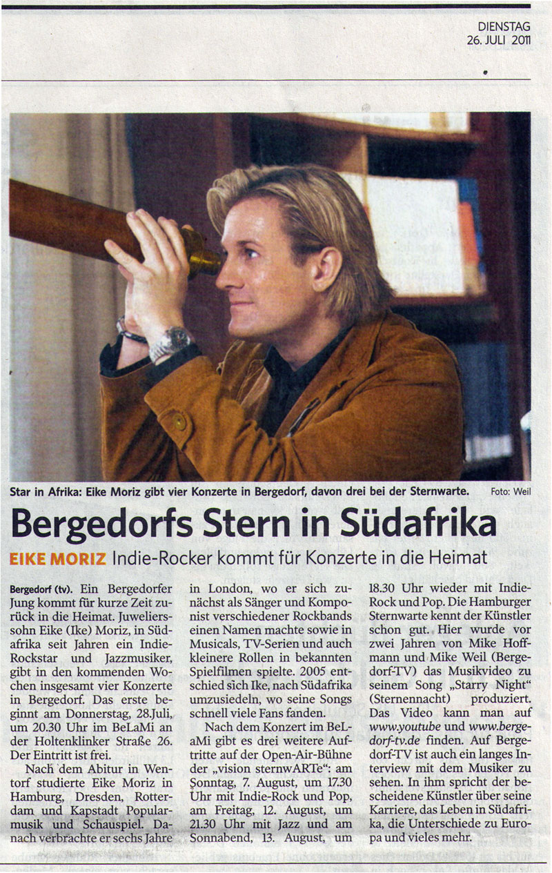 Do., 10.7.: Ike MorizRock, Indie, Jazz"Eike" Moriz ist in Hamburg Bergedorf geboren, aufgewachsen und zunächst auch hier zur Schule gegangen. Später wechselte er auf das Gymnasium Wentorf, wo er 1991 auch Schulsprecher war, wohnte aber nach wie vor in Bergedorf. Nach dem Abitur studierte er in Hamburg, Dresden, Rotterdam und Kapstadt Popularmusik und Schauspiel. Danach verbrachte er 6 Jahre in London, wo er sich zunächst als Sänger-Komponist verschiedener Rockbands einen Namen machte sowie in Musicals, TV-Serien und auch kleinere Rollen in bekannten Spielfilmen spielte. In 2002 veröffentlichte er in London seine erste Single "Fall into the sun", die in Zusammenarbeit mit dem Produzenten von George Michael entstanden war. Ein Jahr später folgte dann sein erstes Album "Mirrors & Shade", das auch international Beachtung fand. 2005 erschien sein zweites Album "Play Me". Im gleichen Jahr entschied sich Ike, nach Südafrika umzusiedeln, wo seine Songs genau wie in England schnell begeisterte Fans fanden. "His rock/Indie sound is accoustic and edgy but still made for easy listening!" "Sein Indie-Sound ist akkustisch und mit Ecken und Kanten, aber trotzdem angenehm zu hören." FHM: "...this cat writes a fine tune. Listen to it wearing velvet and drinking martinis!" "... er schreibt tolle Melodien. Am besten hört man sie im Samt-Anzug und Martinis trinkend." The Citizen: "South Africas own Indie-Pop idol !" "Südafrika hat sein eigenes Indie-Pop Idol" Auch in den vergangenenen Jahren war der junge Mann extrem fleißig, wobei er sich zeitweise mehr dem Jazz zuwandte, der in Kapstadt sehr beliebt ist. Neben Coverversionen alter Meister wie Dean Martin oder Frank Sinatra, Latin Songs und verjazzten Weihnachtslieder hat Ike auch in diesem Genre eigene Werke produziert. Bei seinem Auftritt wird er Songs aus beiden Musikrichtungen präsentieren, leicht hörbaren Jazz aber natürlich auch seinen einprägsamen und eigenen Rock- und Indie-Sound. Darunter auch Stücke von seinem neuen, dem nunmehr 14. Album "At Last" - mit Blues-, Rock- und Pop-Songs im Moriz Style. Das Stück "To Cape Town" ist seiner Wahlheimat Kapstadt gewidmet. |
